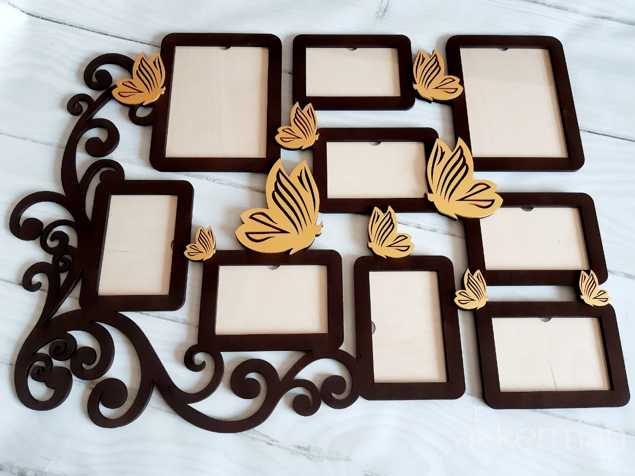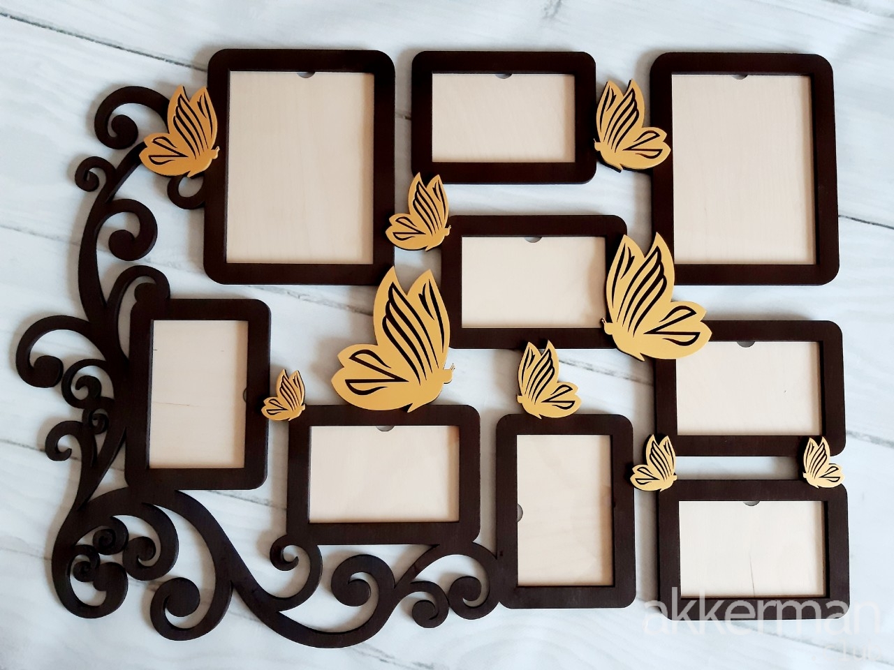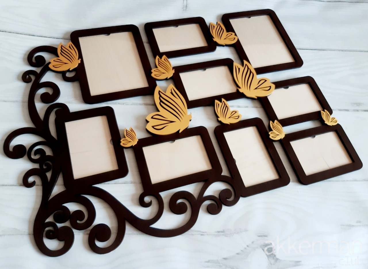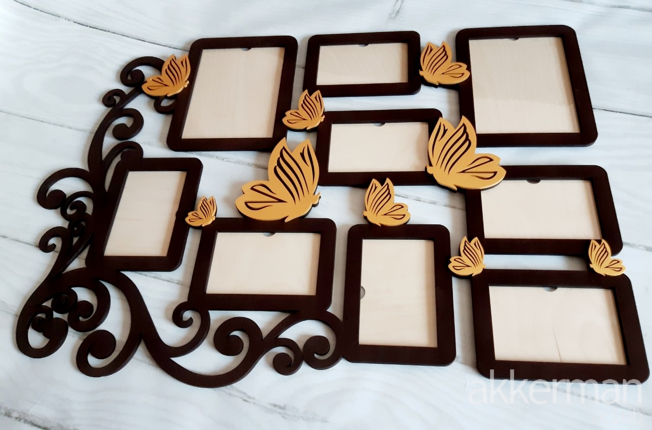 Рамка из дерева , изготовлена способом лазерной резки с наложение второго слоя реза, золотые слова и бабочки в 2 D изображении.